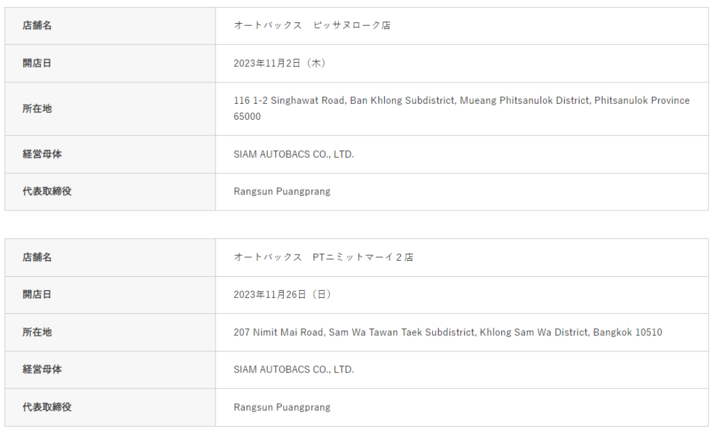 株式会社オートバックスセブン(代表取締役 社長:堀井勇吾)とタイ国内におけるエリアフランチャイズ契約を締結しているSIAM AUTOBACS CO., LTD.(代表取締役:Rangsun Puangprang)は、2023年11月に以下2店舗を新規オープンいたしました。