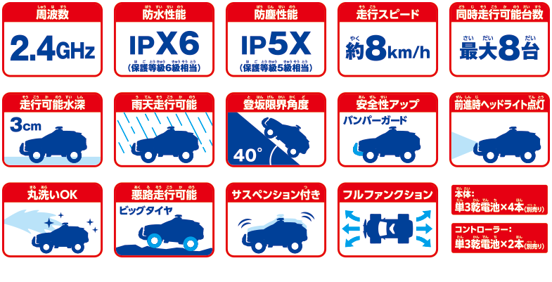 車体とコントローラーを同期させるため混信がなく、本商品同士あるいは他のスプラッシュRシリーズのように同じ周波数帯を使用しているトイR/Cとの同時走行可能(本商品同士では8台まで可能)!