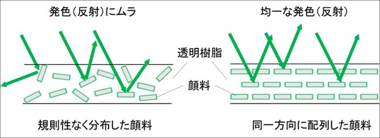 具体的には、加飾フィルムに使用している顔料は、特定の波長を反射して発色する半透明の自動車塗装向け顔料を利用している。この顔料は鱗(うろこ)のような形状のため、色ムラなく均一な発色を実現するには、顔料が同一方向を向くよう配列させ、塗膜の厚みを高精度に均一(数マイクロメートル)にコントロールする必要がある。そこで、自動車外装を加飾ラッピングする樹脂フィルムの製造技術を応用し、透明樹脂の中に顔料を浮遊させ、顔料が同一方向に配列されるよう透明樹脂をシャープな刃で一方向に伸ばすことで、色ムラなく均一に発色する加飾フィルムを実現した。