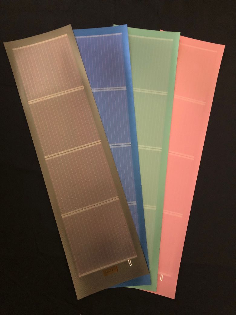再生可能エネルギーのひとつ太陽電池の普及が進むなか、その設置場所が建物の屋根上から壁面、モビリティなどへと広がりが見られてきている。そのため従来の黒色や紫色などの太陽電池に加えて、周囲の景観に合った高意匠の太陽電池のニーズが高まっている。通常、太陽電池をフィルムで覆うと太陽光が透過せず発電しなくなる。今回トヨタとNPACが開発した加飾フィルムは太陽光の大部分が透過できるため、太陽電池の発電量を大幅に損なうことなく、ピンク、ブルー、グリーンなどカラフルな色で太陽電池を加飾できるという特長がある。