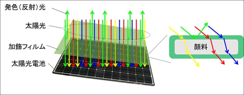 人が物体の色を知覚するのは、光源からの光が物体にあたり、その物体が反射した光が網膜上の視細胞を刺激することによって「色(反射物体色)」として認識するためである。今回トヨタとNPAC、F-WAVEが開発した加飾フィルムに含まれる顔料は特定の波長の太陽光を反射することで人に「色」を認識させつつ、残りの太陽光は透過することができる。