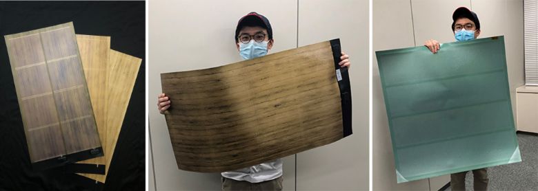 今回開発した加飾フィルムは太陽光を透過するため、太陽電池に装着しても発電できるというメリットがある。ただ発色のため加飾フィルムの表面でわずかに光が反射するため、約10%ほどの発電量低下が発生する。例えば、加飾フィルムを装着した太陽電池は、加飾フィルム無しの場合と比べて、木目調(写真左)では約90%※2、緑色(写真右)では92%※2の発電量が確認されている。発電量の低下率は発色の濃さや色相によって異なる。