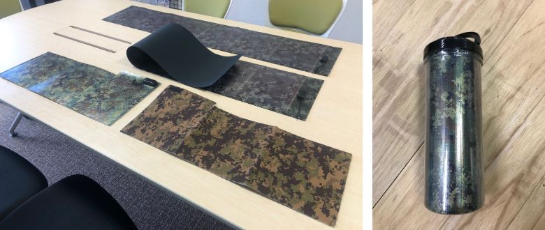 迷彩柄の加飾フィルム(左)を活用し、迷彩柄の太陽電池を製作。
