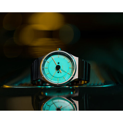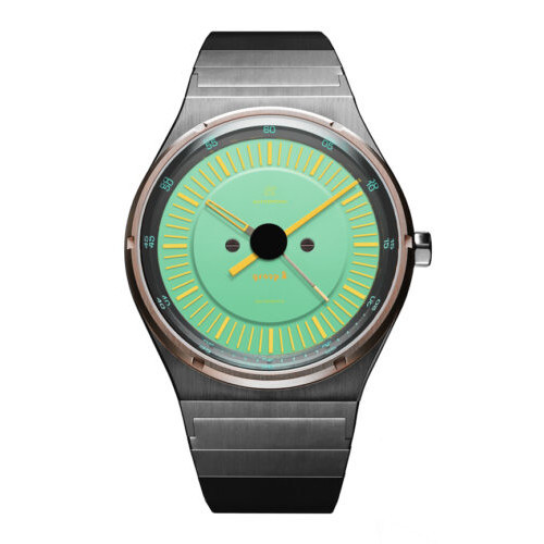 既に完売してしまった「CORSICA BLUE」は、ターコイズブルーの文字盤 × オレンジのダイヤル(針)の組み合わせでしたが、新色AQUAは、エメラルドグリーンの文字盤にイエローのダイヤルの組み合わせとなっております。「ハイテク」な装備が満載で、グループBが最も熱かった1980年代に触発されたメーター類のデザインがモチーフ。