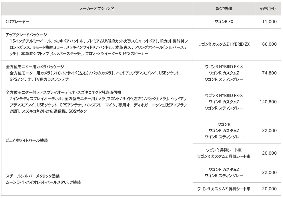スズキ株式会社は、軽乗用車「ワゴンR」、「ワゴンR スティングレー」、福祉車両ウィズシリーズ「ワゴンR 昇降シート車」を一部仕様変更するとともに、新たに「ワゴンR カスタムZ」、「ワゴンR カスタムZ 昇降シート車」を設定し、8月30日より発売する。今回の仕様変更ではデュアルカメラブレーキサポート、全車速追従機能付きのアダプティブクルーズコントロール(ACC)、及び車線逸脱抑制機能を一部のグレードを除いて標準装備し、安全機能が充実した。