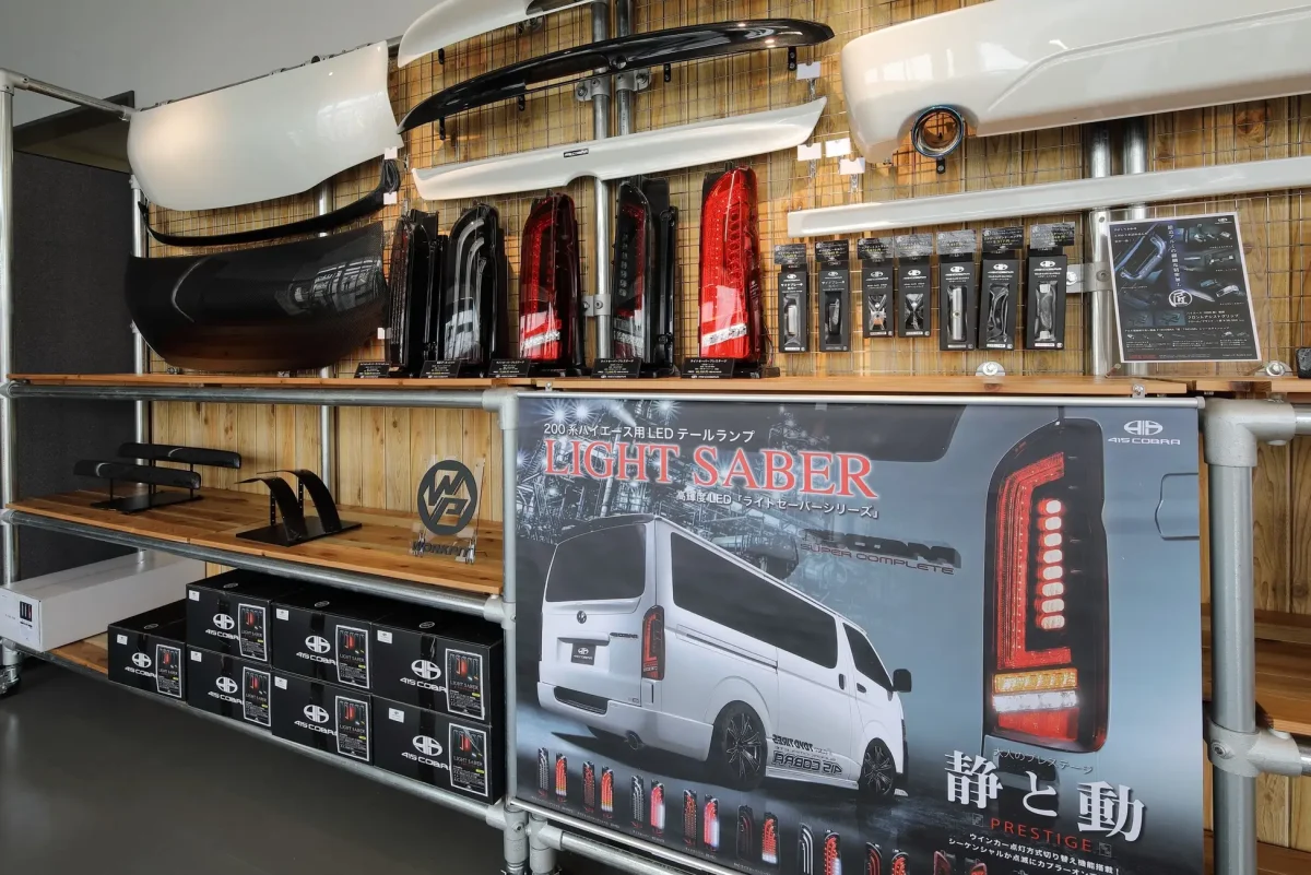 ハイエースのドレスアップに応えるため、計14の⼈気メーカーのカスタマイズ製品を展示。 中でも「415コブラ」は関西で⼈気を誇るハイエースカスタムパーツメーカーで、関東のトヨタ販売店で初となる常時販売を行います。存在感が上がるアルミホイールや他の車とオシャレに差をつけるテールレンズ、車内が明るく華やかになるシートカバー、収納性の高いコンソールボックスなどを揃えました。高品質で評価の高いアイテムを幅広く取り扱います。