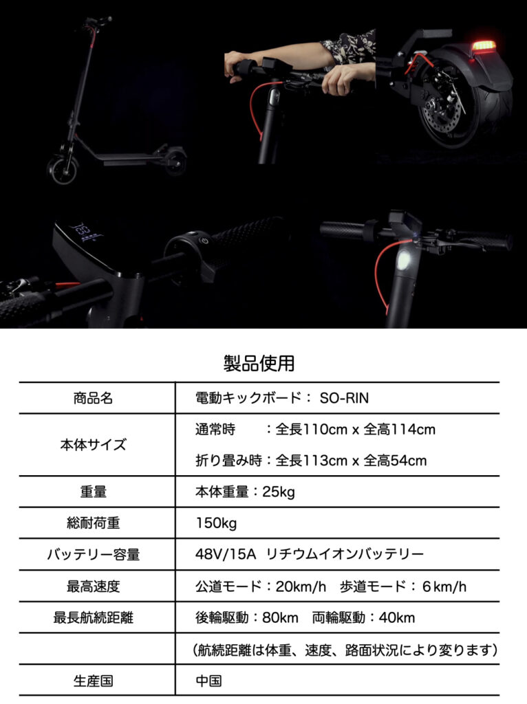 前後両輪駆動システム搭載の600wハイパワー!法改正にも対応した新時代の電動キックボード「SO-RIN」登場。