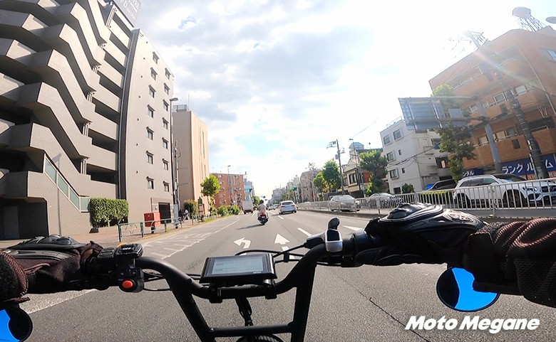 アクセルは親指でハンドルに付いたレバーを押す形状。動き出しはスムーズ。スピードもすっと30km/h無理なく出すことができます。意外と余力があるので、車線変更もへっちゃらですよ。
