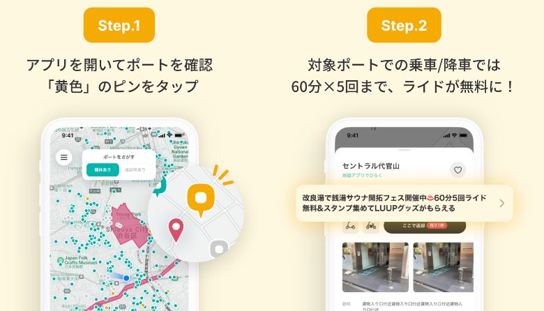 LUUPアプリをダウンロードし、ユーザー登録を行ってください。対象のポートから通常通りライドを開始することで、自動的に60分間無料の状態でライドが開始する。なお、ユーザー登録にはクレジットカードの登録が必要だが、60分以内の乗車であれば課金はされない。