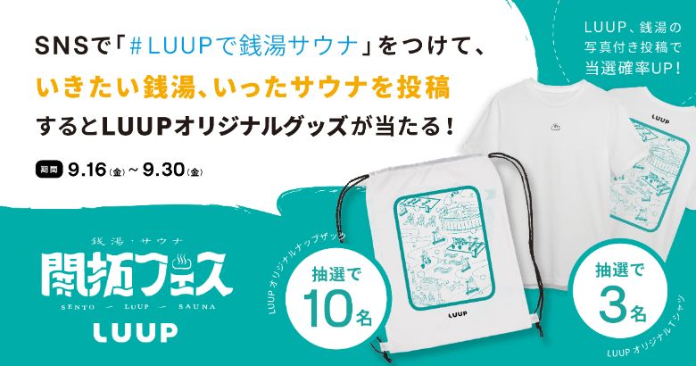 Twitter、もしくはInstagramでLUUPの公式アカウントをフォローし、「#LUUPで銭湯サウナ」をつけて投稿すると抽選でLUUPオリジナルグッズが当たります。銭湯・サウナやLUUPの写真付きの投稿で当選確率UP!