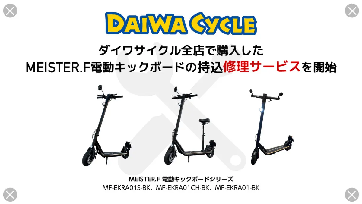 MEISTER.Fは全国のダイワサイクルにて販売した、公道走行対応モデルの電動キックボードの持込修理サービスを開始