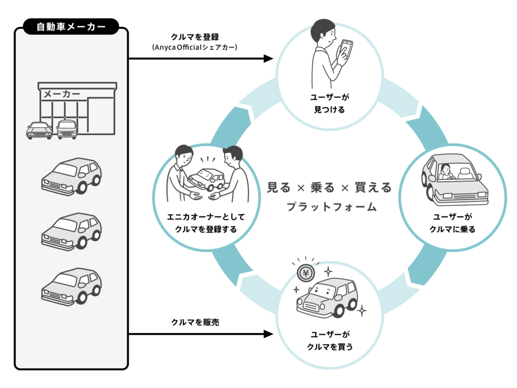 「Anyca Official シェアカー」でのカーシェア利用後に、もしクルマを気に入れば、アプリから各自動車メーカーのウェブサイトで購入検討することも可能です。また、クルマの購入後に個人間カーシェアのオーナーとして「エニカ」を活用すれば、車両の維持費軽減も期待できます。弊社では、これからも「見る×乗る×買える」プラットフォームを推進し、自動車メーカーとの協業を増やすことでクルマ販売のDX化を推進していきたいと考えております。