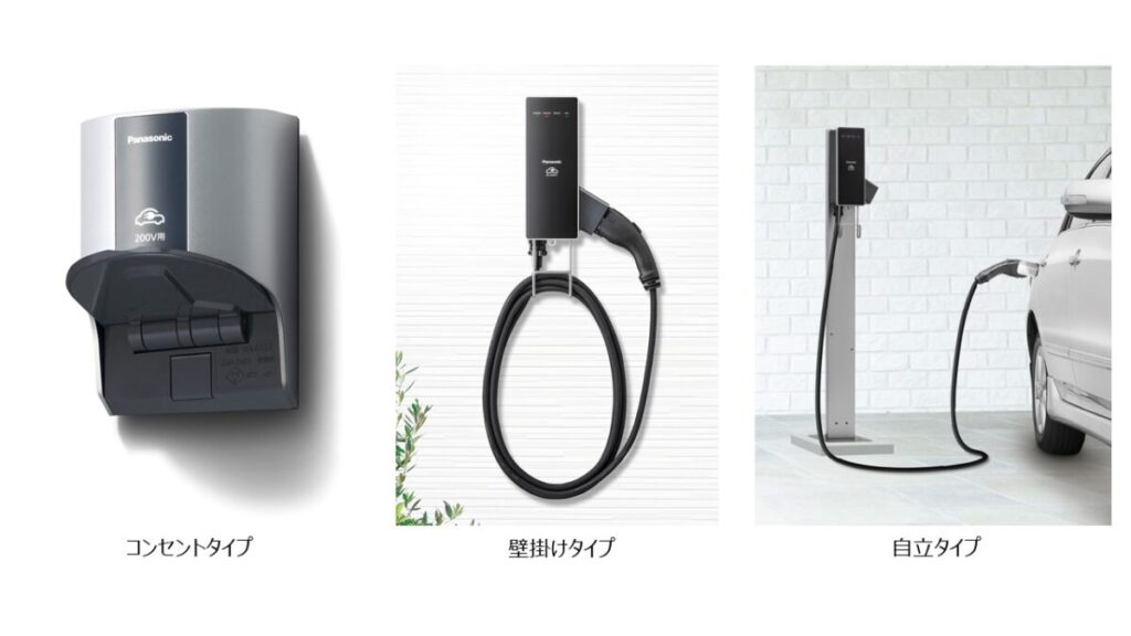 家庭用EV充電器は、パナソニック株式会社の機器となります。取り付け方式はコンセントタイプ、壁掛けタイプ、自立タイプの3パターンを用意しており、壁掛けタイプ、自立タイプの2タイプは、充電出力3kWと6kWからお選びいただけます。