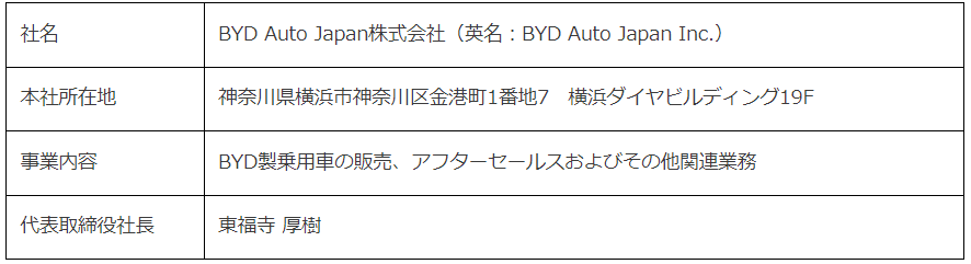 BYDの日本法人 ビーワイディージャパン株式会社の100%出資子会社として設立したBYD Auto Japanは、日本におけるBYDの乗用車販売サービス専業会社です。