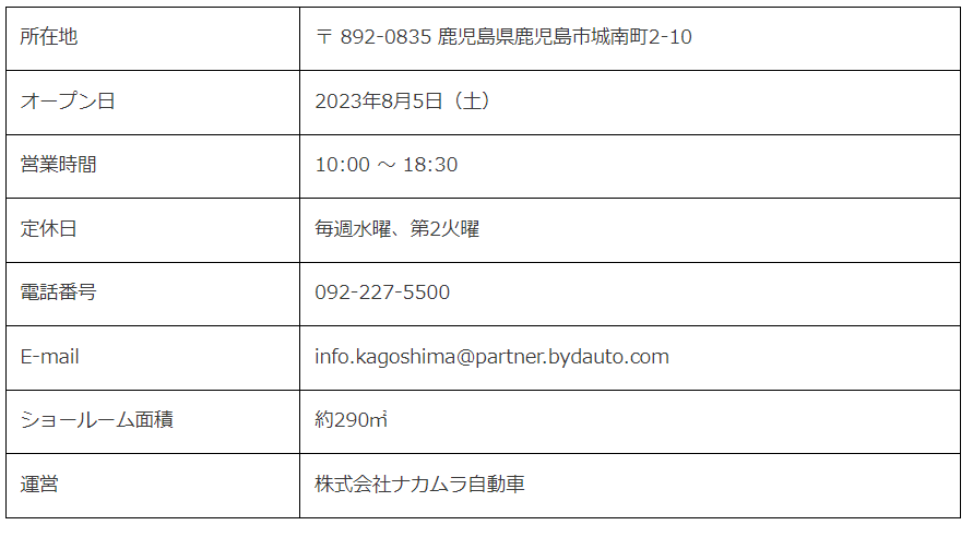 BYDの日本法人であるBYD Auto Japan株式会社(本社:神奈川県横浜市、代表取締役社長:東福寺 厚樹、以下 BYD Auto Japan)の正規ディーラーである株式会社ナカムラ自動車(本社:鹿児島県鹿児島市、代表取締役社長:中村 大輔)は、2023年8月5日(土)、鹿児島県鹿児島市に「BYD AUTO 鹿児島」をオープンいたします。