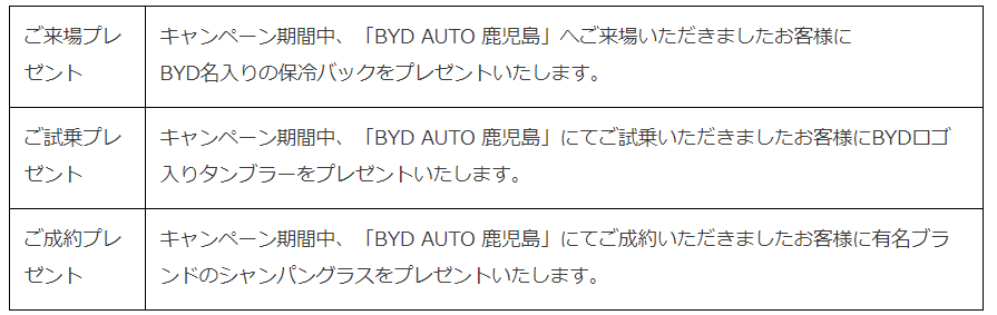 *本キャンペーンの詳細は、BYD AUTO鹿児島へお問い合わせください。