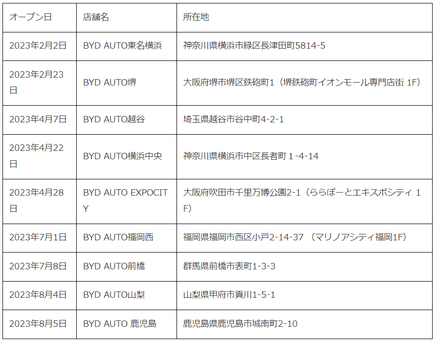 BYD Auto Japanは、2025年末までに100を超えるショールームを備えた店舗を全国に作ることを目標に掲げています。ショールームを備えた正規ディーラー店舗として、2023年2月にオープンした「BYD AUTO東名横浜」を皮切りに、以下9つの店舗をオープンいたしました。