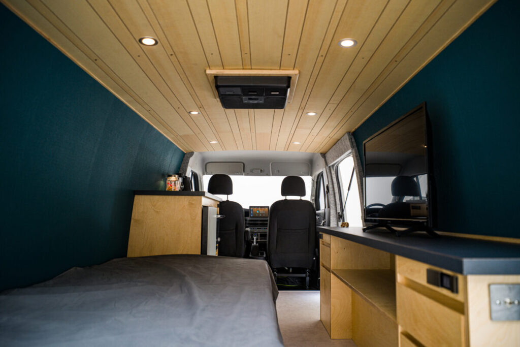 「T-01」に完備したベッドは、固定のシングルからセミダブルサイズに拡張ができ、大人2名が就寝可能です。