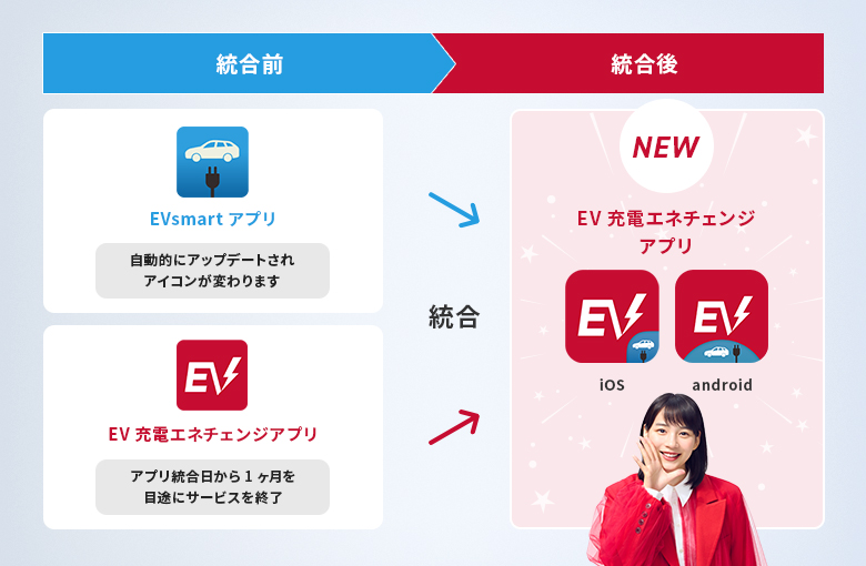 2023年6月28日(水)配信のアップデートにより、EVsmartアプリは自動的に「EV充電エネチェンジ」アプリに移行され、新しいアプリアイコンが表示されます。既存の「EV充電エネチェンジアプリ」は現状の赤色のアイコンから灰色へと変化し、2023年7月末をめどにサービスを終了する予定です。