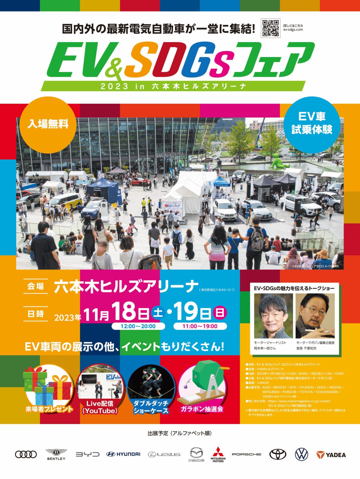 EV&SDGsフェア実行委員会(株式会社モーターマガジン社内。事務局:株式会社新創社)は、2023年11月18日(土)~19日(日)の2日間、国産・輸入ブランドの電気自動車やプラグインハイブリッド車などの魅力が体感できるイベント「EV&SDGsフェア2023 in 六本木ヒルズアリーナ」を六本木ヒルズアリーナにて開催いたします。
