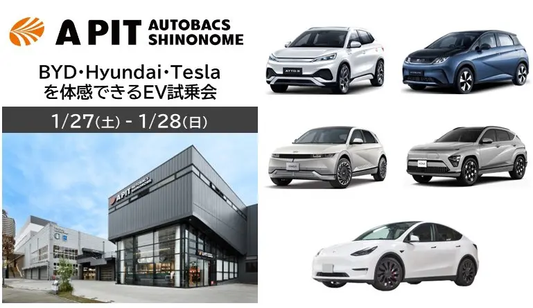 株式会社オートバックスセブン(代表取締役 社長:堀井勇吾)は、直営のコンセプトストア「A PIT AUTOBACS SHINONOME(東京都江東区)」にて、オートバックスグループ初となるBYD・Hyundai・Tesla の海外EVメーカー3社の車両を体感できるEV試乗会を2024年1月27日(土)・28日(日)の二日間、開催いたします。