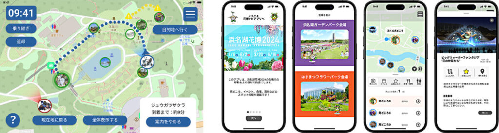 - 貸出車両にはタブレットを装着し、スズキ内製の「浜名湖花博2024ナビアプリ」を搭載し、園内の見どころ案内、お客様が設定した目的地までの案内、進入禁止エリアなど、画面と音声によりお知らせします。