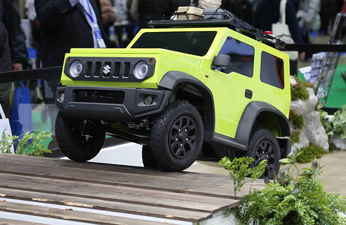 - スマート農業エリアに走行コースを設営し、ジムニーやキャリイのミニチュアボディーを載せた電動モビリティベースユニットの走破性を体験していただけます。