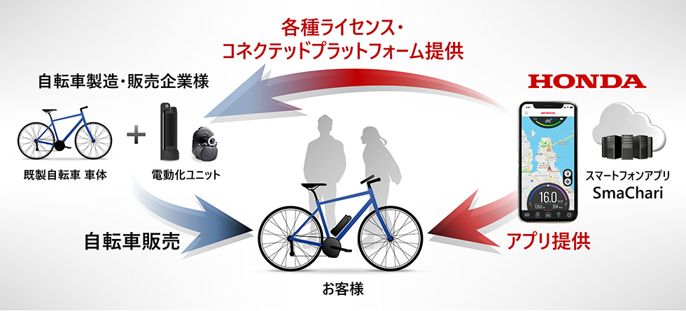 Hondaは、SmaChariのスマートフォンアプリをお客様に提供するとともに、SmaChariを搭載した自転車を製造・販売する企業に対して、電動アシストユニットの制御ソフトウェアに関する技術を始めとする各種ライセンス、ならびにSmaChariを運用・管理するコネクテッドプラットフォームを有償で提供します。