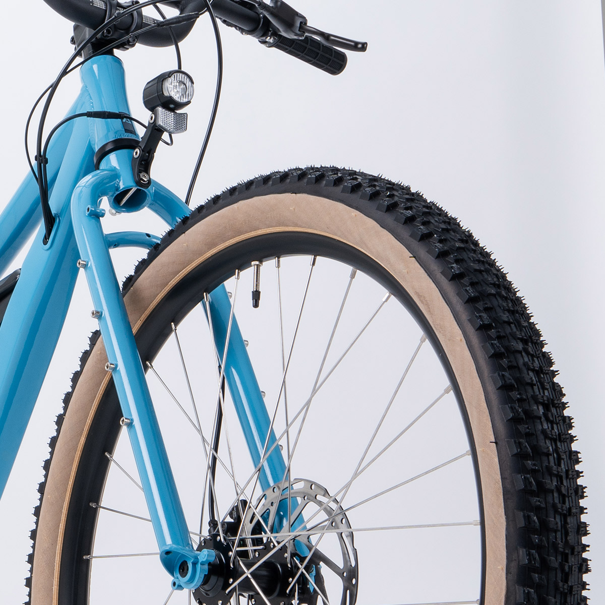オフロード走行に対応した27.5x2.4タイヤ採用。細かいブロック配置によりシティライドにも最適。街なかの段差も難なくクリア。