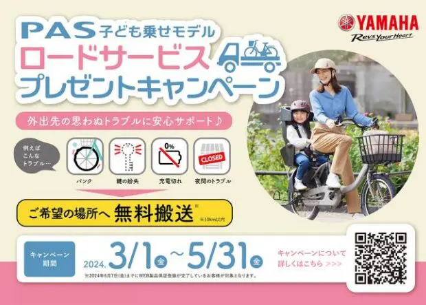 ヤマハ発動機販売株式会社は、「PAS 子ども乗せモデル ロードサービスプレゼントキャンペーン」を実施します。2024年3月1日(金)〜5月31日(金)のキャンペーン期間中に、電動アシスト自転車「PAS」の子ども乗せモデル(幼児2 人同乗基準適合車※1)を新車で購入いただき、Web 製品保証登録してくださった方全員に、24 時間対応可能の 10km ロードサービスを 1 年間付帯するものです。