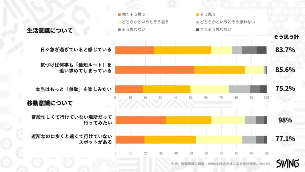 SWINGは8月、日本人の生活意識の調査*を実施。「日々急ぎ過ぎている」83.7%、「最短ルートを追い求めてしまっている」85.6%、「本当はもっと無駄を楽しみたい」75.2%(全て6段階評価の上位3項目合計)という結果から、日々急ぎ効率を求めている中でも、本当は無駄や自由を楽しむゆとりを求めていることがわかりました。