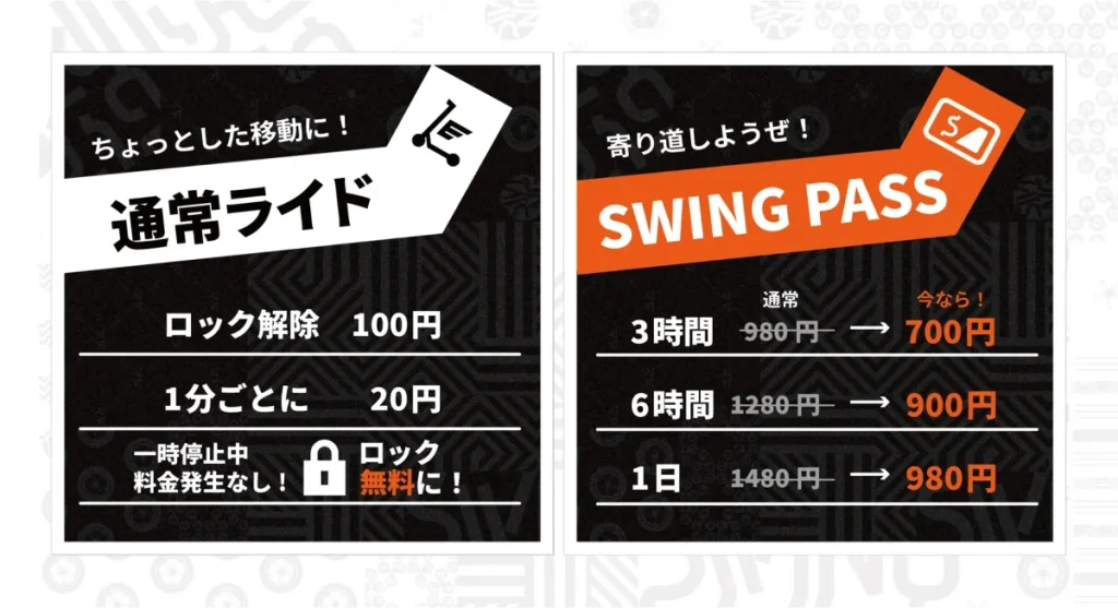 二つ目が、乗り放題パックの「SWING PASS」。より長距離を移動したい方向けのメニューです。時間内にどれだけ乗車頂いても料金固定。まずは3時間700円、6時間900円、1日980円の3つの特別価格メニューで開始いたします。約30分以上のライドが想定される場合(一時停車ロック中含まない)は、SWING PASSをご利用頂くとお得になります。