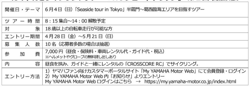 「YPJ ショートトリップ」を開催します。これは、「YPJ」の楽しみ方を体感いただくために、季節に合わせたテーマを決め、約20kmのコースをレンタル車両で走行するガイド付きサイクリングツアーです。