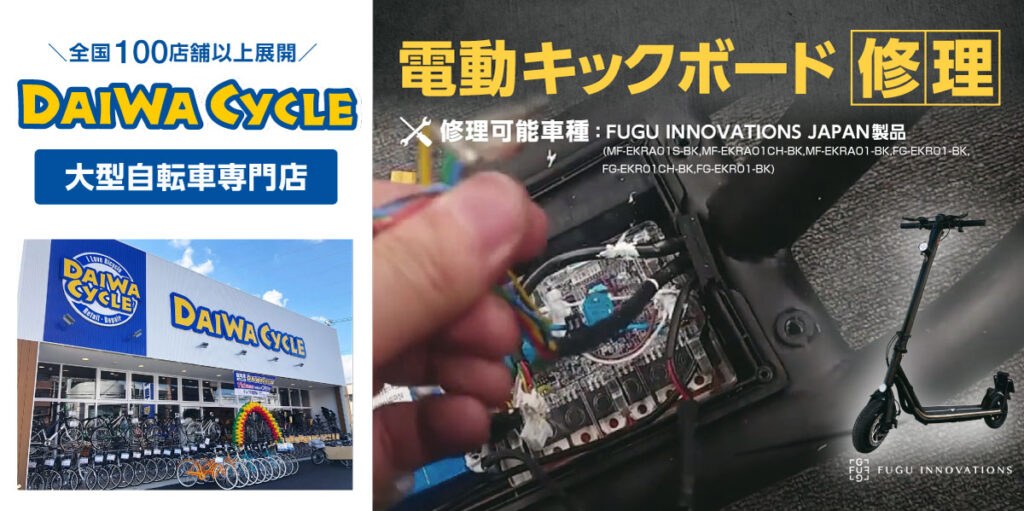 株式会社FUGU INNOVATIONS JAPANは、2023年1月から全国107か所(2023年1月現在※詳しくは下段ページ【店舗一覧】をご確認下さい)にあるダイワサイクル・ダイワサイクルSTYLE全店で販売した、MEISTER.F電動キックボードの持込修理サービスを開始しました。