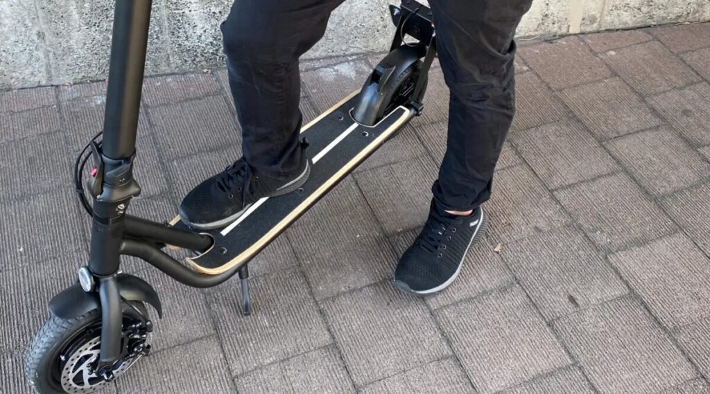 他の電動キックボードとは趣の異なるスケートボードと同じウッドデッキを採用したスタイリッシュなデザイン。