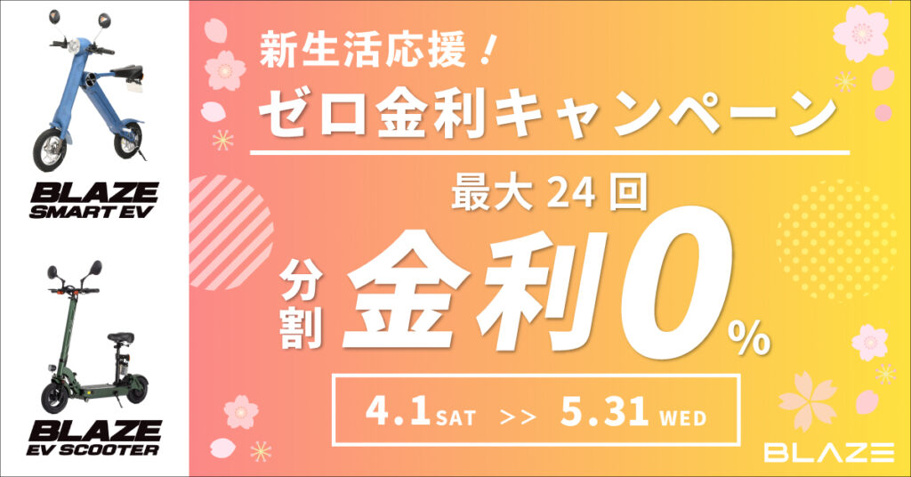5月31日まで、電動バイク「ブレイズ スマートEV」および「ブレイズ EVスクーター」を対象とした「ゼロ金利キャンペーン」を実施しております。