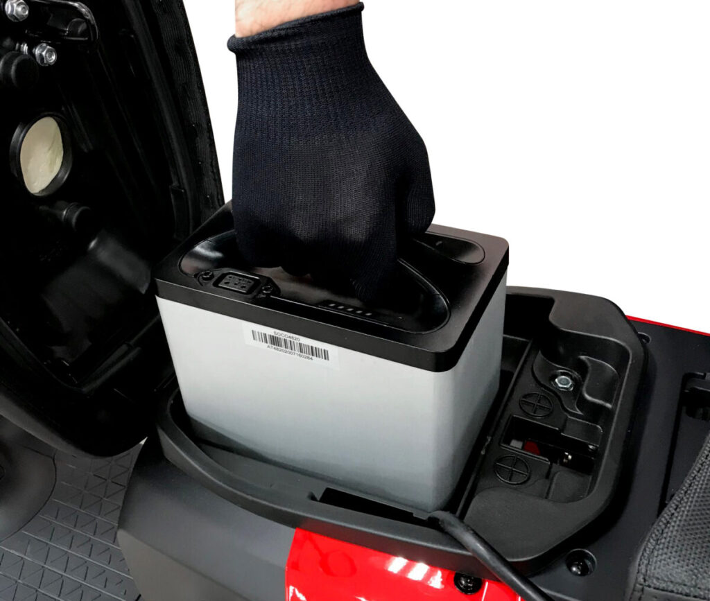 バッテリーは家庭用コンセント(100V)で充電でき、シート下に収納されています。