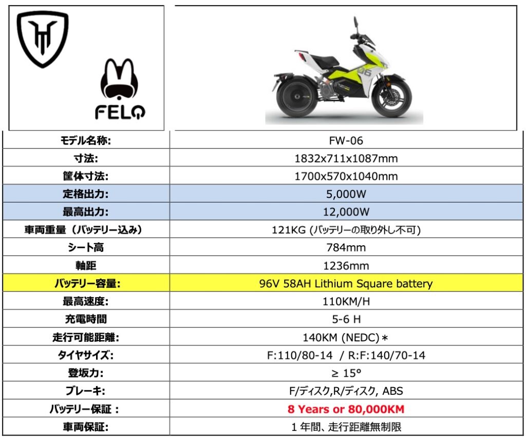 モータリスト合同会社は、中国・上海に本社を置く、HYT Moto社の電動スポーツスクーター「FELO FW-06」の取り扱いを開始する。96V58Ahの大容量バッテリーを搭載し、フレーム強化メンバーとして機能できるよう設計されているため、しっかりとした剛性感があるのが特徴。6時間の充電で最大約140kmの走行が可能、車両重量は121kgで、最高速度は110km/hとなっている。