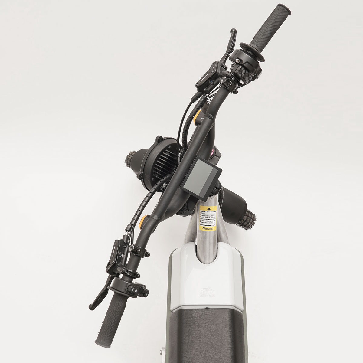 前後に対向4ポッドの油圧ブレーキを装着し、フロント203ミリ径、リア160ミリ径のブレーキローターとの組み合わせにより、車格に対して余裕のある制動力を備えます。自転車規格のブレーキですが、長めのレバーを使用し、スロットルボディやスイッチボックスが間に挟まっていても十分な長さを確保しています。