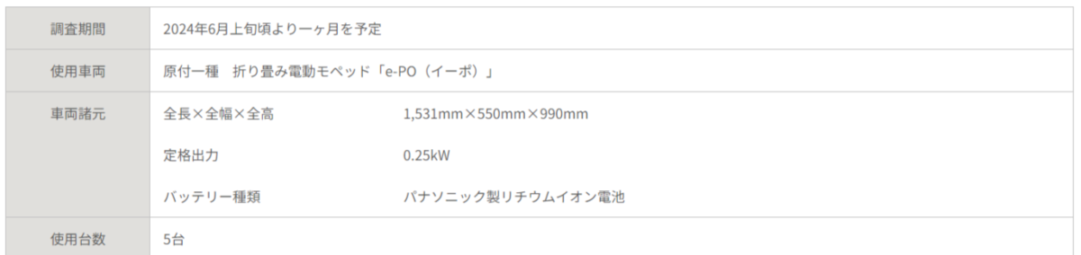 スズキ株式会社は、パナソニック サイクルテック株式会社と共同開発した、原付一種の折り畳み電動モペッド「e-PO(イーポ)」の公道走行調査を、2024年6月上旬頃より実施すると発表した。