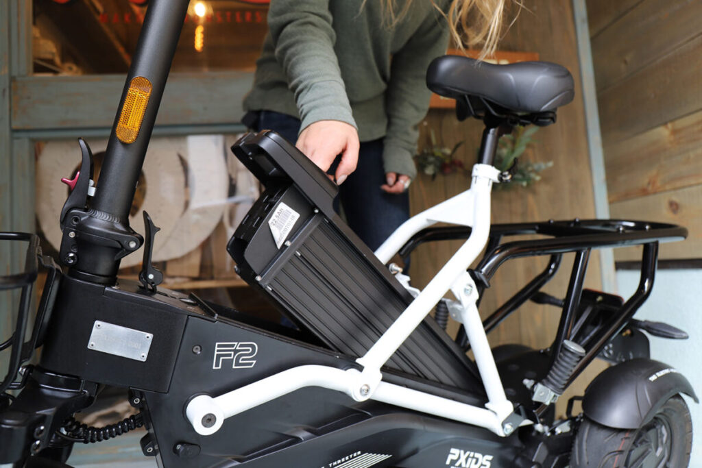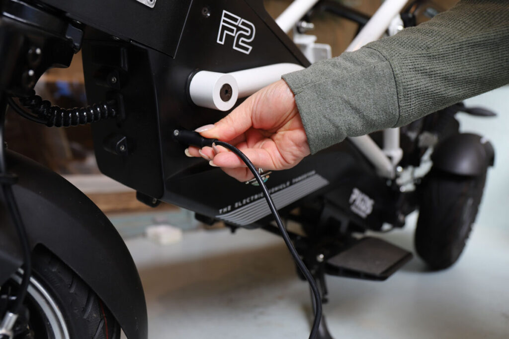 乗る人の体重や積荷のほか走行する道路の傾斜や路面状況によって異なりますが、航続距離は満充電のバッテリーで約45kmとなります。充電は家庭用コンセントが使えるので、バッテリーを車載したまま車両本体にコードを繋ぐかバッテリーを取り出して自宅内で繋ぐか、どちらでもできます。