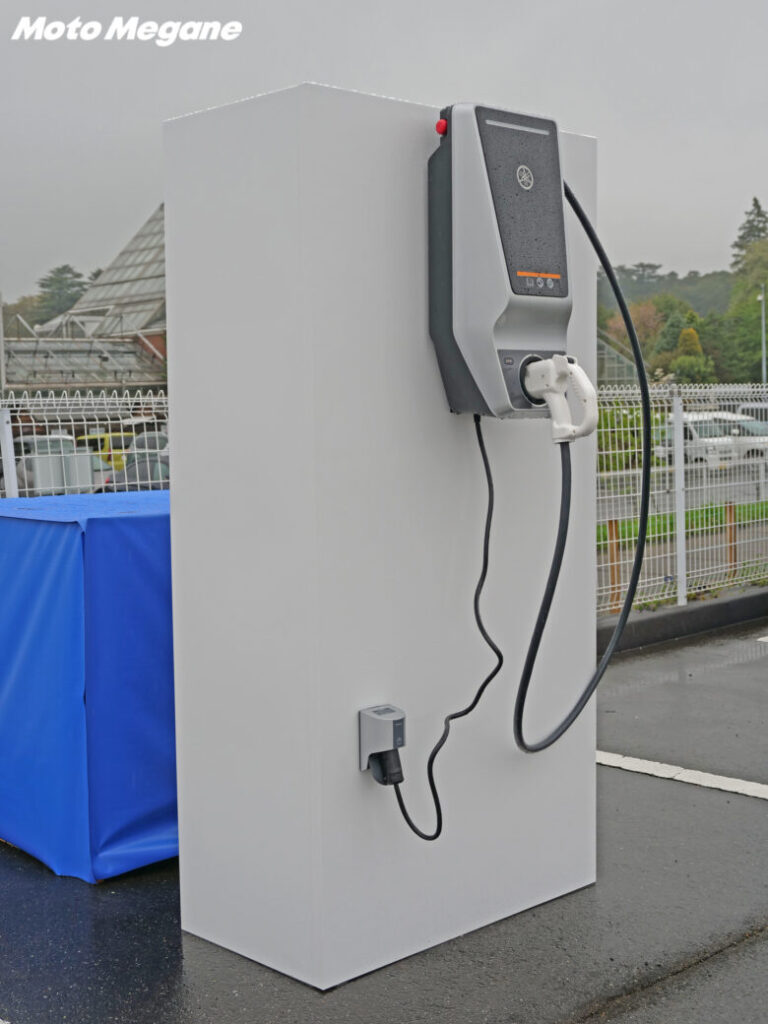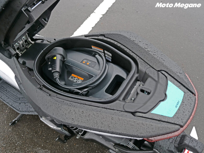 燃料となるガソリンの代わりに動力源となるバッテリーを搭載した「E01」は、100(航続可能距離)×100(最高速度)を想定して開発され、自社で開発・組み立てた車両固定式バッテリーとすることで大容量・高出力を実現し、満充電での走行距離は104km(60km/h定地走行テスト値)。ざっくり片道約3~40km圏内であれば通勤・通学などの都市間の移動では充分なスペックとなっており、充電器についてもディーラーやシェアリングなどに配置予定の「急速充電器(写真左)」に加えて、自宅などに設置可能な「普通充電器(写真右)」、シート下のトランクスペースに入れて持ち運ぶことも可能な「ポータブル充電器(写真下)」の3つのタイプを展開しており、それぞれ満充電までの時間が約1時間(0%→90%)、約5時間(0%→100%)、約14時間(0%→100%)と使用環境に合わせて充電器を選ぶことができる。