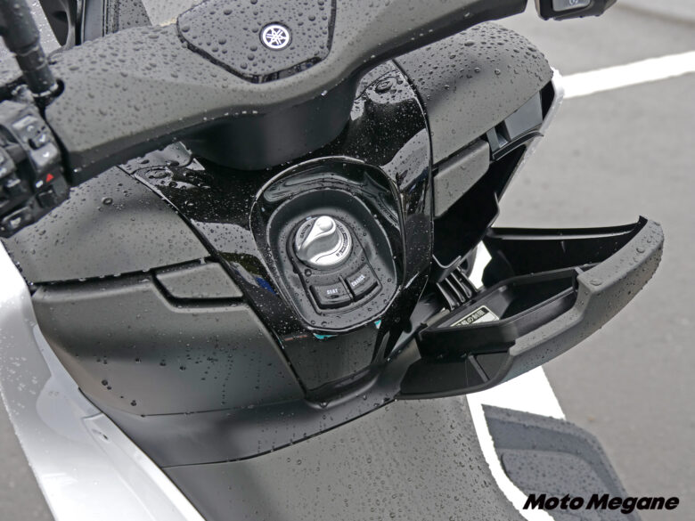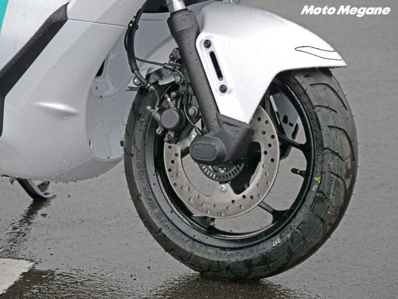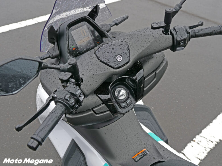 雨で湿った空気の中、スマートキーとすることでキーを差す必要のないメインスイッチをONに合わせると、視認性の高い縦型レイアウトのマルチファンクションメーターが素早く立ち上がる。ブレーキを握ってハンドルボックスのスイッチを押したら、スロットルを捻るだけで軽々と、そして非常に静かに走り出していく。ガソリン車と違い、セルスターターを回してエンジンを始動する必要がないというのは新鮮だ。