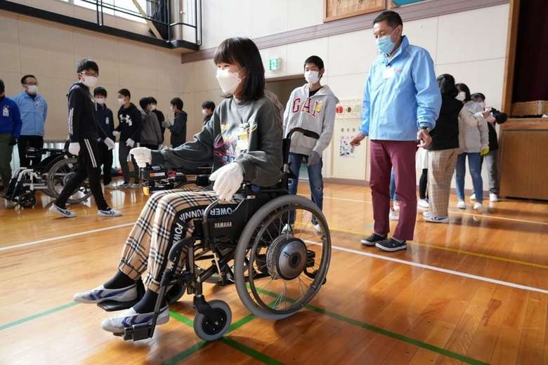 理科室で電気のつくり方とモーターの仕組みを学んだ児童たちは、体育館に移動して電動車いすと電動アシスト自転車の体験試乗も行った。学んだばかりの電気やモーターが、人びとの暮らしにどのように役立てられているのかを全員が体感すると、「スイッチを切った車いすは(操作が)大変だけど、モーターを使うとスイスイ走る」、「電動アシスト自転車は、自分の自転車とは全然違う。坂道でも試してみたい」といった声が聞かれた。