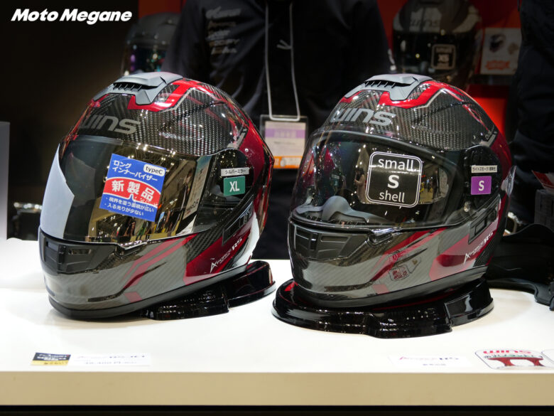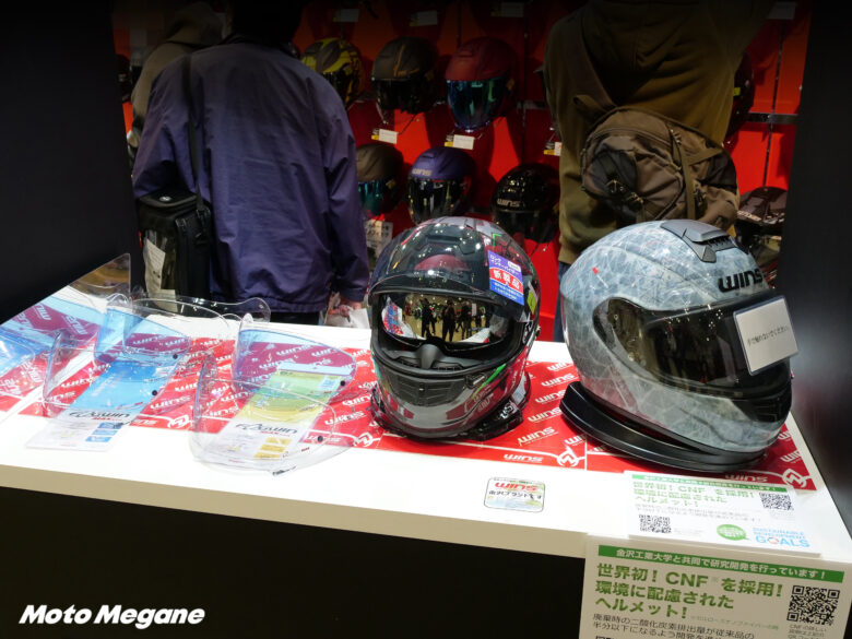 カーボンヘルメットながら手の出しやすい価格と、インナーバイザーを装備することで快適性も高さも嬉しい「A-FORCE RS」シリーズには、これまで全サイズ共通だったシェルを新たにSサイズからXSサイズ向けに分けた小さいサイズのシェルを新開発。昨年登場した「G-FORCE SS」シリーズの新作グラフィックの展示はもちろん、カーボンニュートラルに向けた持続可能な生産環境を視野に入れ、金沢工業大学と共同で開発した植物由来成分「セルロースナノファイバー」を使った素材も見逃せない。