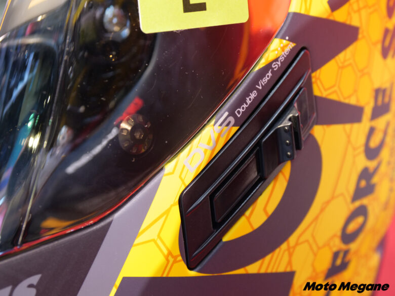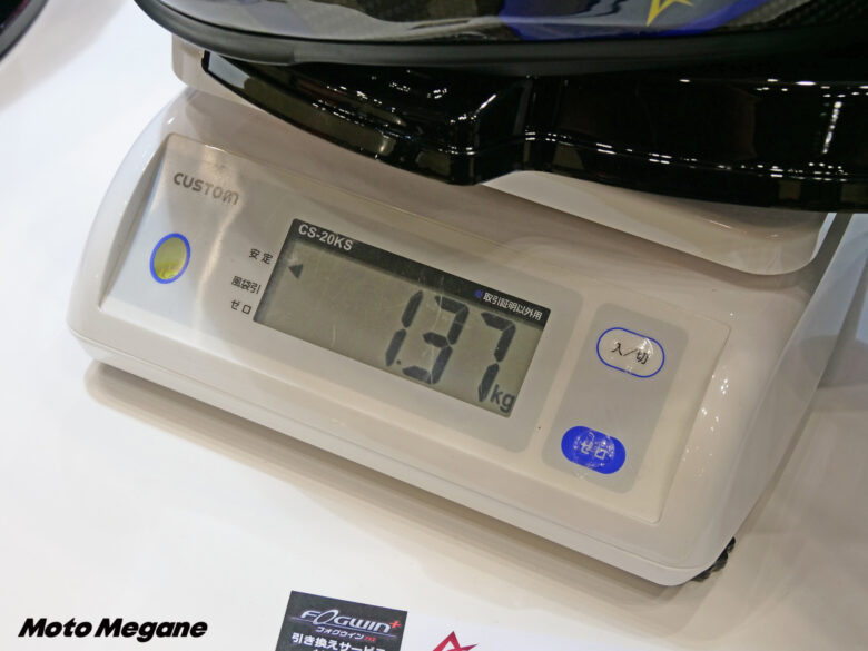 インナーバイザー付きの快適性能が大人気となっている「A-FORCE」シリーズだが、今回登場したtypeCはインナーバイザーが約5mmほど大きくなり、隙間から入る光を極力抑えることによって快適性能をさらにプラスしている。また、カーボン素材を使用しているこのモデルはブースでの実測にして1.37kgという驚きの軽さを実現しており、長時間着用しても疲れにくいのが特徴だ。