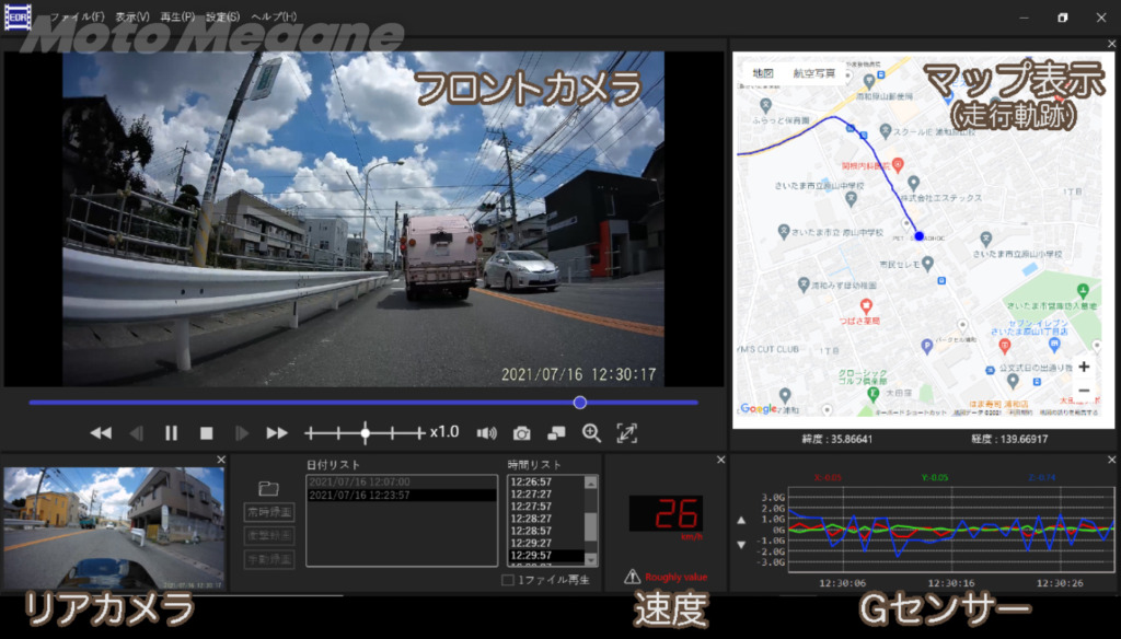 前後映像、走行ルート、速度、車体の姿勢(Gセンサー)まですべて記録できる
