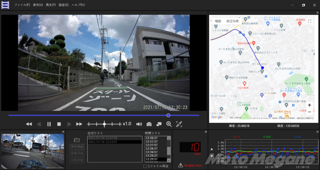 本体内蔵のGセンサーで車体が加速状態だったか?減速状態だったか?まで記録される。記録映像を見てみると、ものすごく精細というわけでも無かった(本体の固定が悪かったのかもしれない)が、加減速や左右のバンクが記録されていた。これもアクシデントの瞬間、ライダーがどういう操作をしていたのかが後で分かる貴重なデータとなるだろう。