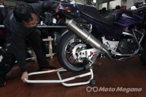 スタンドをかけた状態ならばバイクはビクともせず抜群の安定感をみせる。前後スタンドをかければ作業時の転倒リスクを軽減できるので、普段の仕事で街乗りマシンのメンテ時も入庫したらまずスタンドをかけるそうだ。大きな地震の際も、スタンドをかけたバイクが転倒したことは未だ無いそうだ。