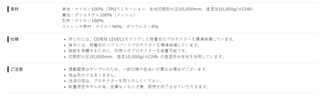 - 肩と肘にはCE規格 LEVEL1の新型プロテクター、背中にはソフトパッドを標準装備することでプロテクション性と快適性を両立しています。